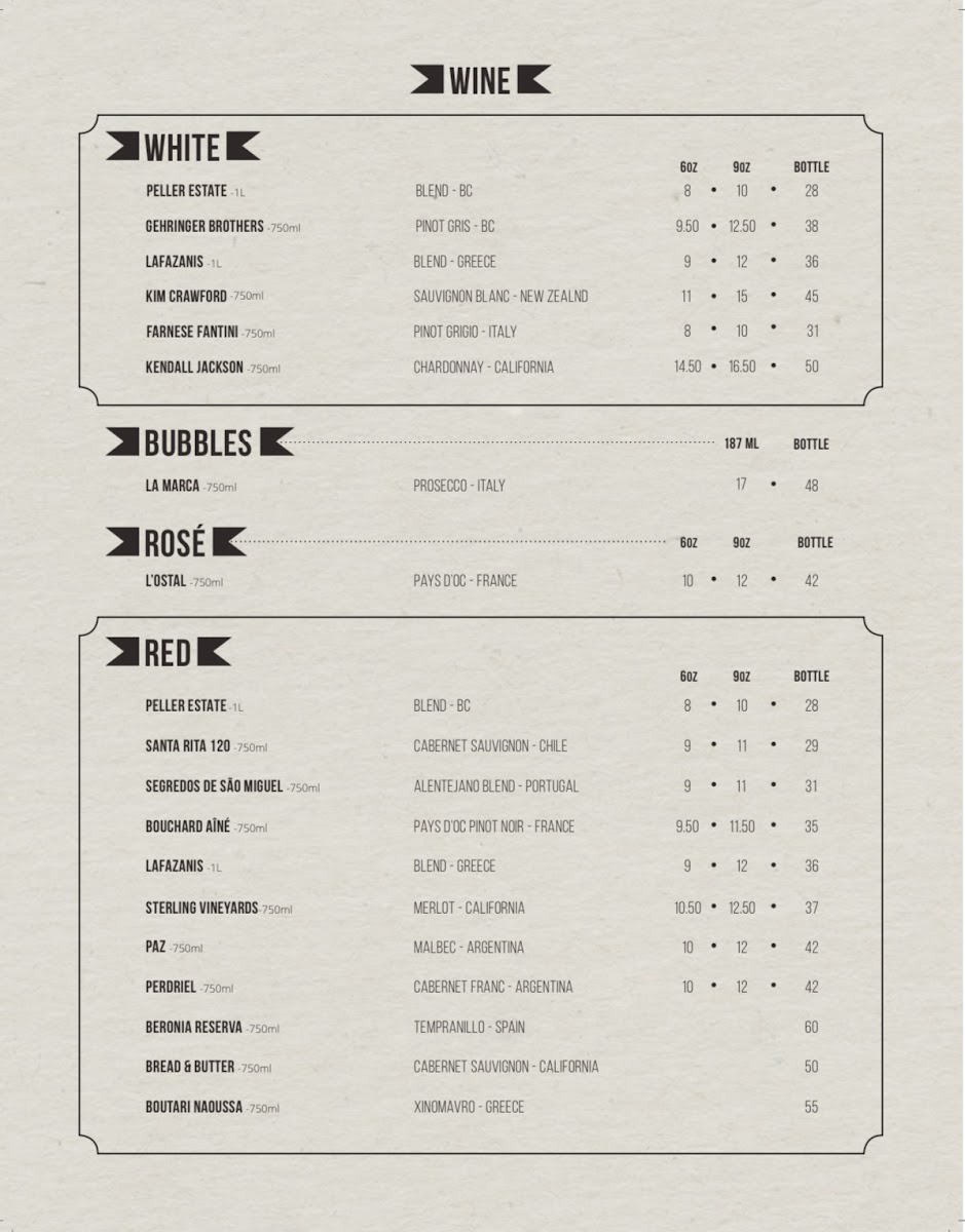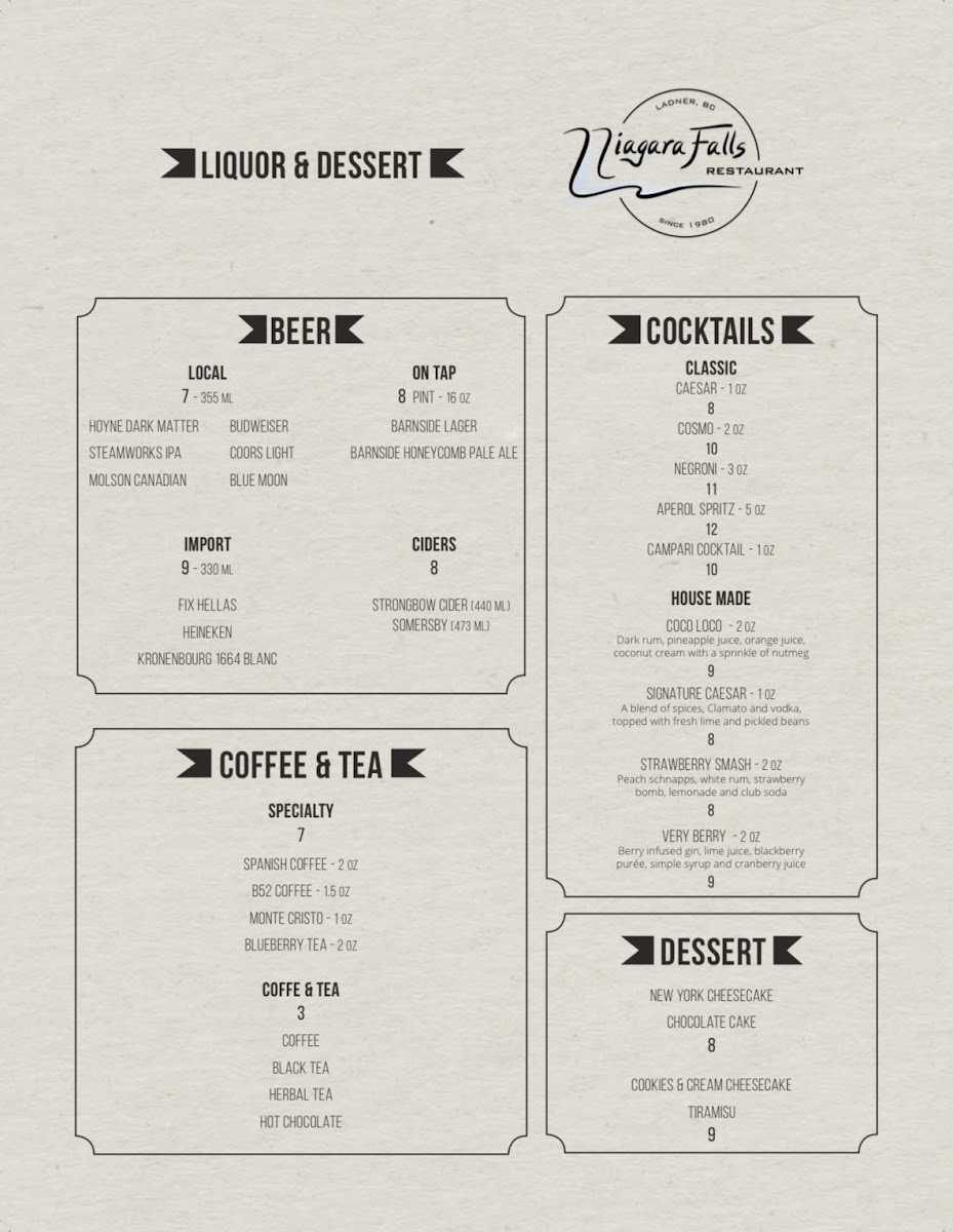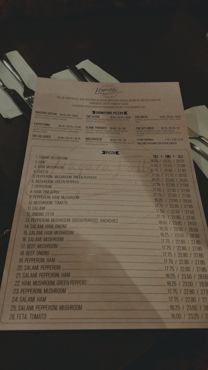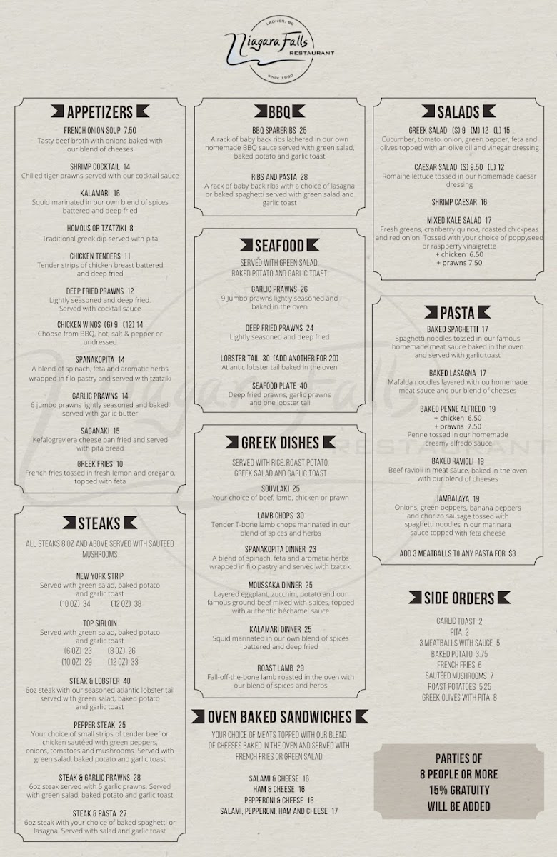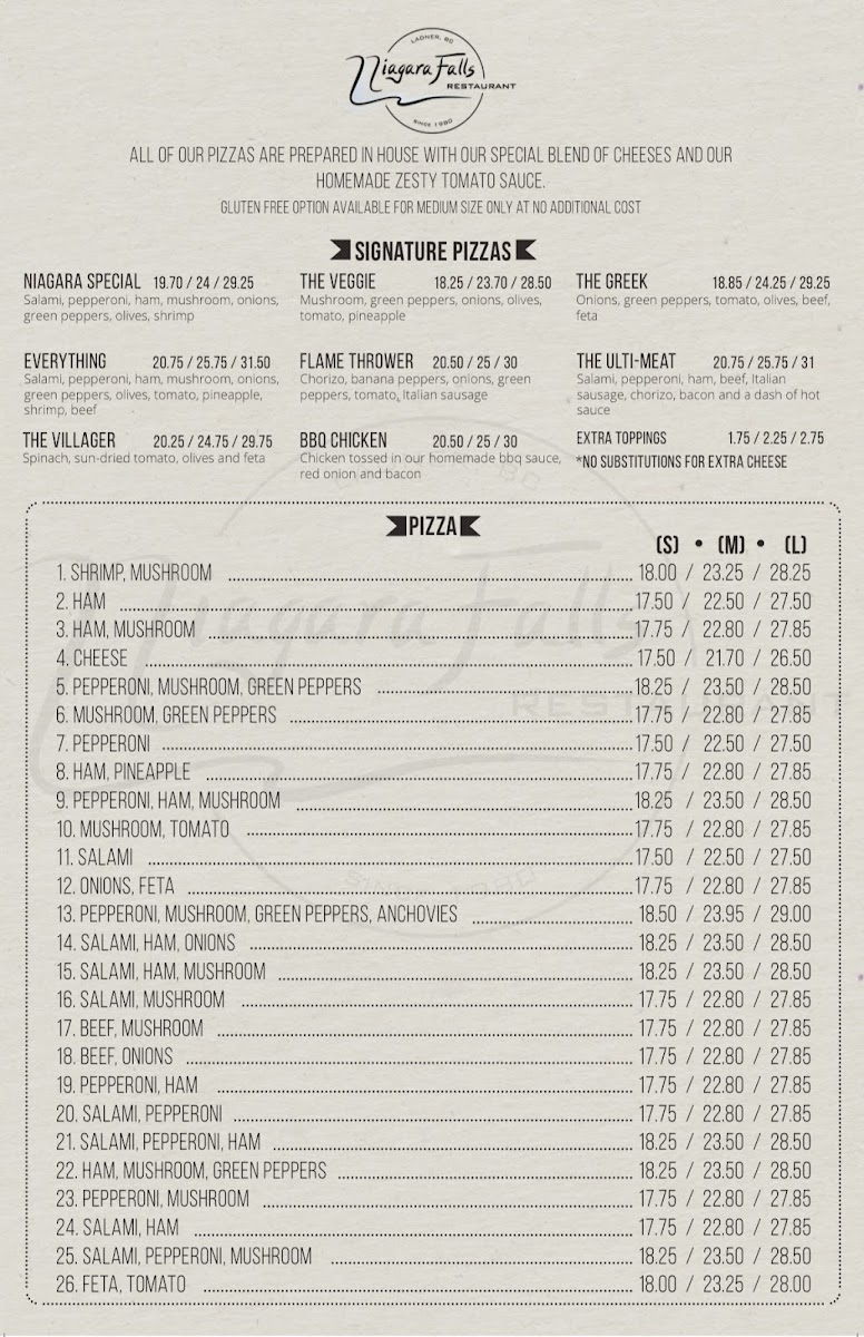 Niagara Pizza Ltd at 4879 Delta St offers a menu that effortlessly blends comfort food with international flavors, making it a versatile spot for a wide range of tastes. Starters like French Onion Soup and Shrimp Cocktail set a classic tone, while Kalamari, Chicken Tenders, and dips such as Homous or Tzatziki provide lighter, shareable options. The Greek section impresses with Souvlaki, Lamb Chops, Spanakopita Dinner, Moussaka Dinner, and Kalamari Dinner, showcasing hearty, traditional flavors. For barbecue enthusiasts, BBQ Spareribs and Ribs And Pasta deliver smoky indulgence. Pasta lovers can enjoy baked classics like Baked Spaghetti, Baked Lasagna, Baked Penne Alfredo, and Baked Ravioli, along with the flavorful Jambalaya. Seafood options are equally tempting, from Garlic Prawns and Deep Fried Prawns to the luxurious Lobster Tail and Seafood Plate. Steak selections, including New York Strip, Top Sirloin, Steak & Lobster, Pepper Steak, and Steak & Garlic Prawns, offer generous portions and rich flavors. Freshness continues with Greek Salad, Caesar Salad, Shrimp Caesar, and Mixed Kale Salad, while oven-baked sandwiches like Salami & Cheese, Ham & Cheese, Pepperoni & Cheese, or combinations of Salami, Pepperoni, Ham and Cheese make for satisfying casual bites. Complementary sides, including Garlic Toast, Pita, 3 Meatballs with Sauce, Baked Potato, and French Fries, round out the meal. Wine selections are thoughtfully curated, from reds like Peller Estate, Santa Rita 120, and Segredos De Sao Miguel to sparkling La Marca, rosé L'ostal, and whites including Peller Estate, Gehringer Brothers, Lafazanis, Kim Crawford, and Farnese Fantini, providing plenty of pairing options. Overall, the menu balances classic favorites, hearty Greek specialties, indulgent seafood and steaks, and approachable pasta dishes, making Niagara Pizza Ltd a reliable choice for diners seeking variety and generous portions in Delta.